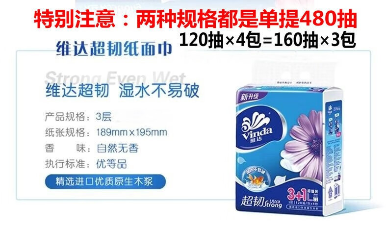 商品名称:维达(vinda)袋装纸巾 面巾纸 餐巾纸 超韧三层 维达抽纸 软抽L码 大码纸抽 120抽 单提