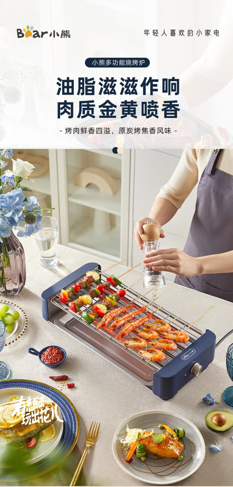 小熊(Bear)烧烤炉 电烧烤炉 烧烤架 烤肉机烤串机家用电烤炉烧烤 单层大容量不粘无烟大功率